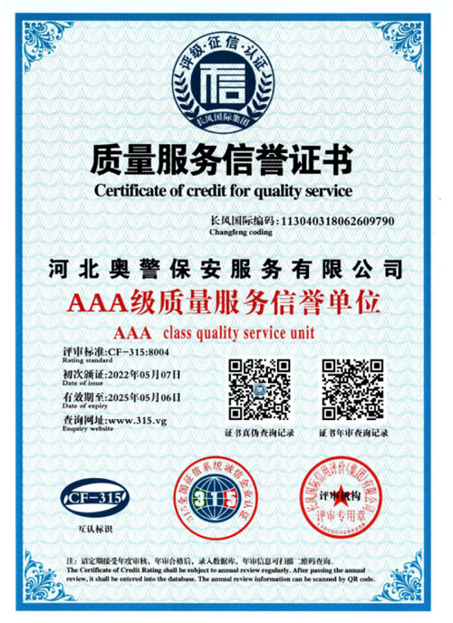 河北奧警保安服務(wù)有限公司成立于2017年7月20日,注冊資金1000萬元,具有中華人民共和國《保安服務(wù)許可證》(編號:冀公保服20180085)的綜合性安保企業(yè)。
